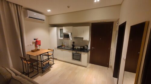 Comfortable Accommodations: The apartment includes one bedroom and a living room with a kitchenette. Amenities include air-conditioning, a washing machine, and a dining area. Free on-site private parking is available, along with a minimarket and outdoor seating area.